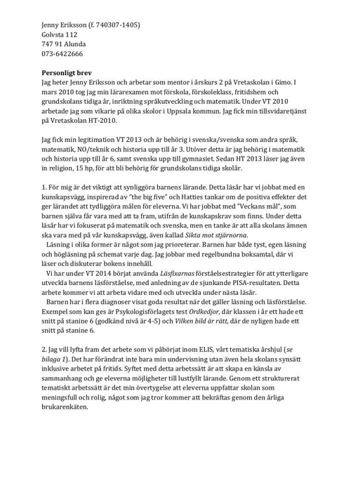 Personligt Brev Jenny Eriksson